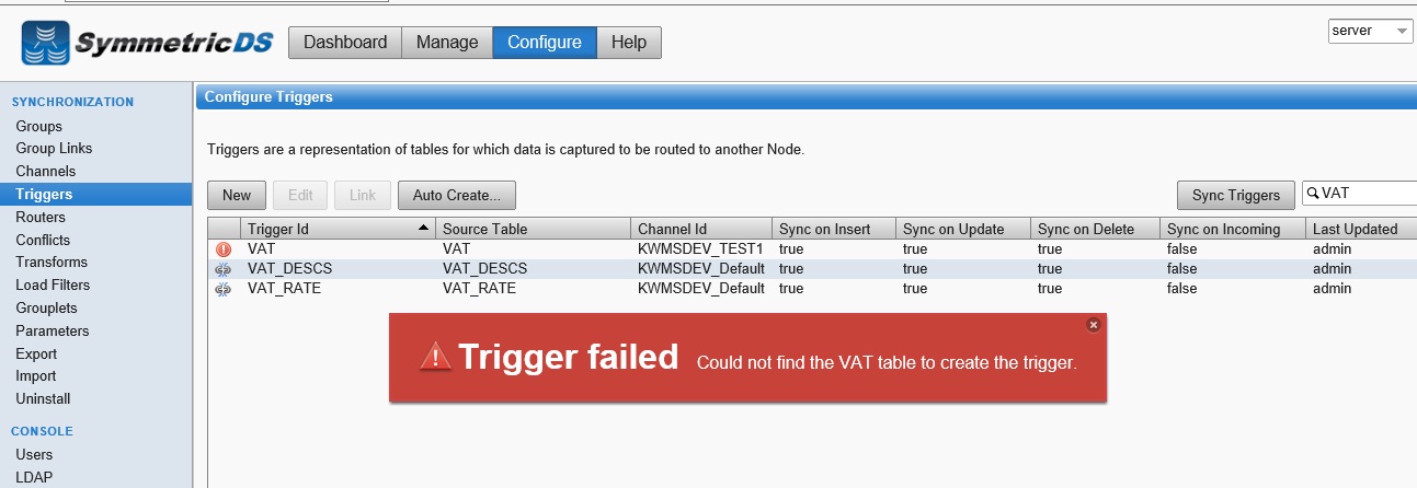The log shows the following: 11:54:11 AM CST ERROR [TriggerRouterService] [server-job-19] Failed to retrieve tables for trigger with id of VAT 11:54:11 AM CST ERROR [TriggerRouterService] [server-job-19] Could not find any database tables matching 'VAT' in the datasource that is configured 11:54:11 AM CST INFO [TriggerRouterService] [server-job-19] Done synchronizing triggers These are the column definitions in VAT, ID is primary key ID NUMBER(38,0) CODE VARCHAR2(20 CHAR) CREATED_BY VARCHAR2(300 CHAR) CREATED_DATE DATE MODIFIED_BY VARCHAR2(300 CHAR) MODIFIED_DATE TIMESTAMP(6) WITH LOCAL TIME ZONE |