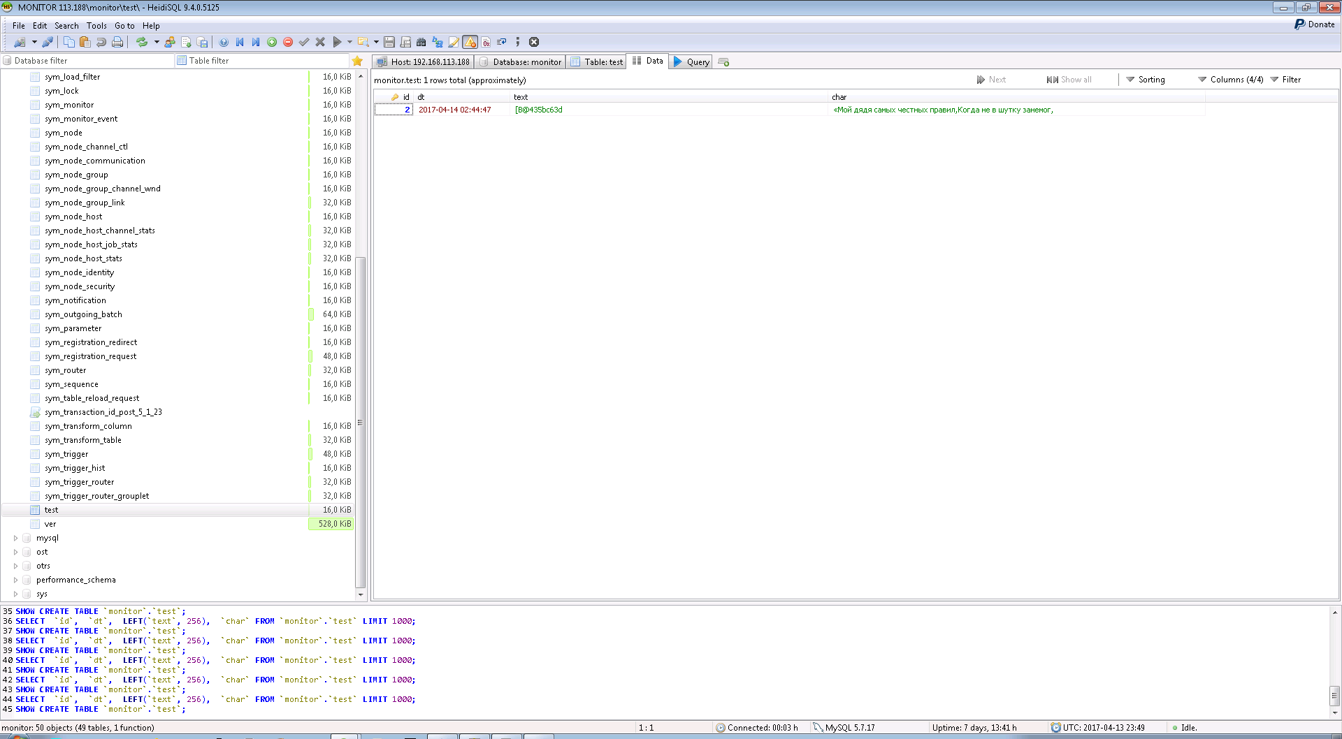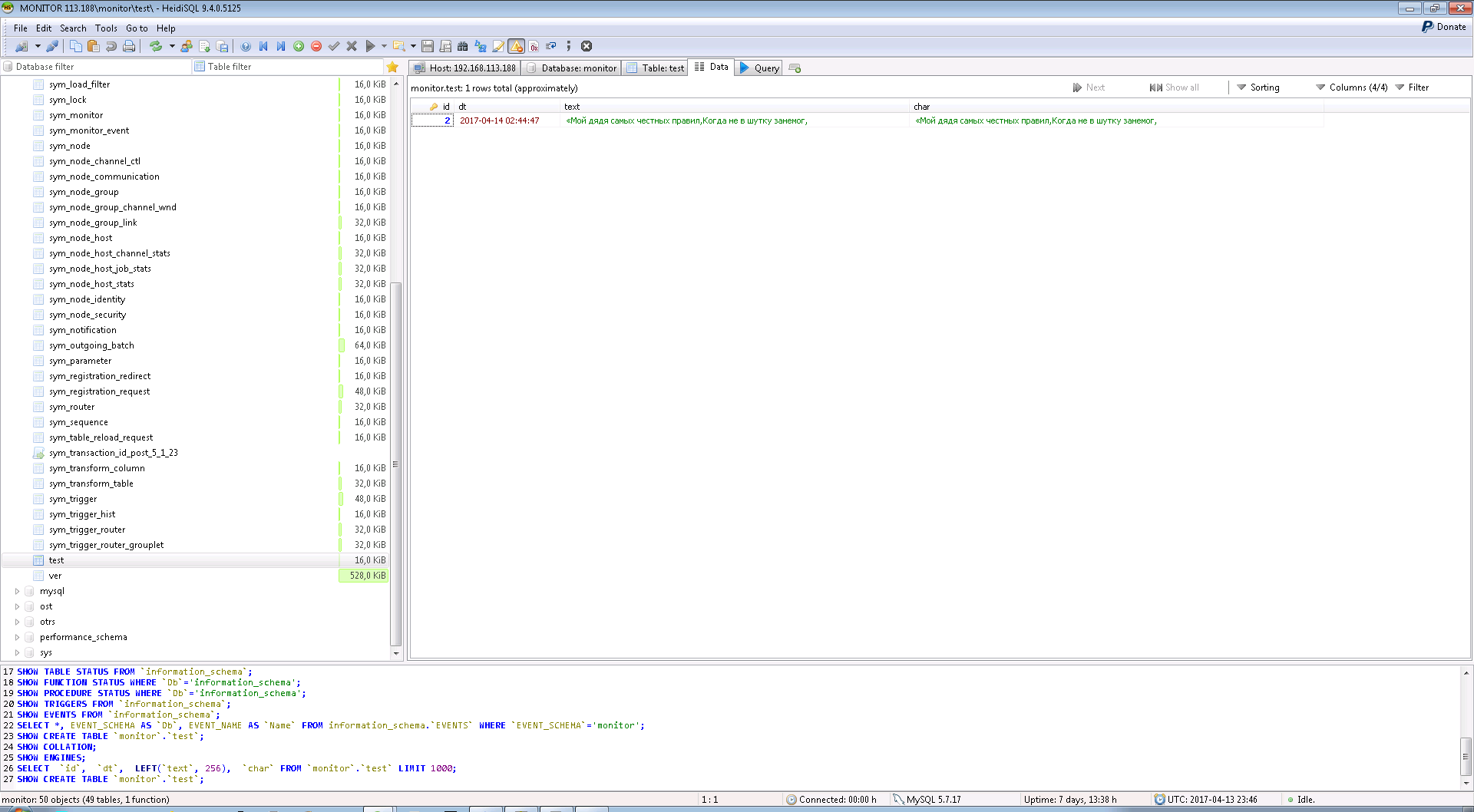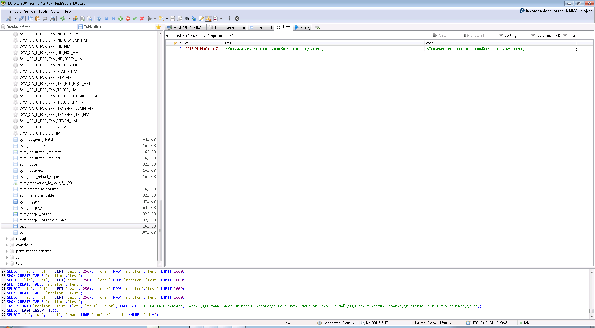 100% reproduced. Definitions as above. I've created table for testing - test. CREATE TABLE `test` ( `id` INT(10) UNSIGNED NOT NULL AUTO_INCREMENT, `dt` TIMESTAMP NULL DEFAULT NULL, `text` TEXT NULL COLLATE 'utf8mb4_bin', `char` VARCHAR(200) NULL DEFAULT NULL COLLATE 'utf8mb4_bin', PRIMARY KEY (`id`) ) COLLATE='utf8mb4_bin' ENGINE=InnoDB ; linked it with trigger and trigger_router. 1. Inserting some UTF data - OK(pic), replicated correctly(pic) 2. Making reload node or table ./symadmin reload-table test -p ../engines/home-000.properties -n 001 FAIL, TEXT type column - garbled, varchar - OK (pic)  |