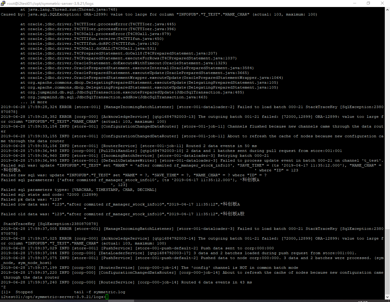 Description | (MY SYMMETRIC SETTING : 1 MASTER NODE(ORACLE) ,1 SLAVE NODE1(ORACLE), 1 SLAVE NODE2(MYSQL) WHEN SYNC FROM ORACLE TO ORACLE, ERROR OCCURED, AND Sql message in sym_outgoing_batch is : ORA-12899: value too large for column "INFOPUB"."T_TEST"."NAME_CHAR" (actual: 103, maximum: 100) Here datatype of column INFOPUB.T_TEST.NAME_CHAR is char(100). The parameter "nls_language" in my oracle is "SIMPLIFIED CHINESE". I tested as following cases: 1: SYMMETRIC version: 3.9.20,3.9.21,3.8.43,3.10.3, above bug occured every times. 2: symmetric 3.5.10 has no such bug. 3: COLUMNS WITH VARCHAR2 DATATYPE HAVE NO ABOVE BUG Can anyone give me some helps? or I dont config some parameter in SYMMETRIC? | ||||