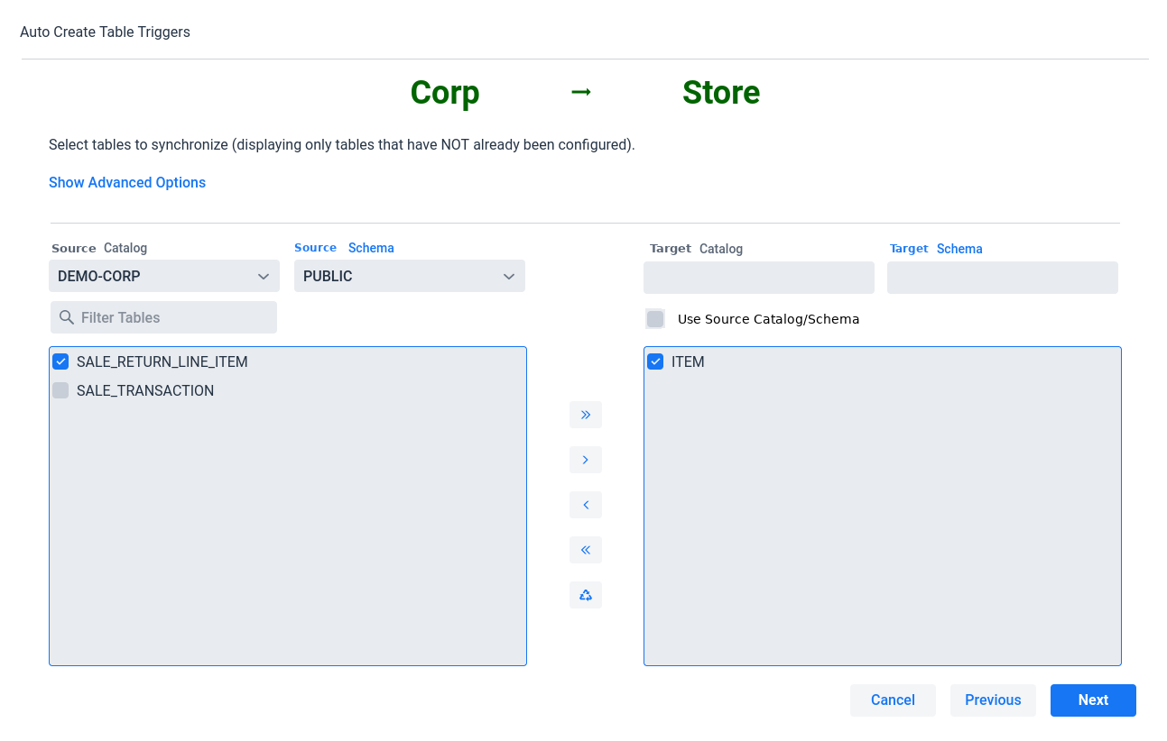 | Description | - Re-label "Trigger Prefix" and "Trigger Suffix" to "Trigger Id Prefix" and "Trigger Id Suffix" - Re-label "Catalog" and "Schema" to "Source Catalog" and "Source Schema" - Move filter below source catalog and schema - Add "Target Catalog" and "Target Schema" text fields to right side with checkbox below. These correspond to the fields on sym_router that the user selected in the first step of the wizard. When going to next screen, check if there are existing trigger routers using the router. If not, then update the router with the new target catalog/schema and checkbox settings. If so, check if the the old target catalog/schema and checkbox value are different than current, and if so, make a new sym_router. Maybe use the same logic used for "Save as Copy" to get the new router ID.  | ||||