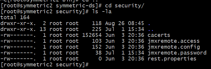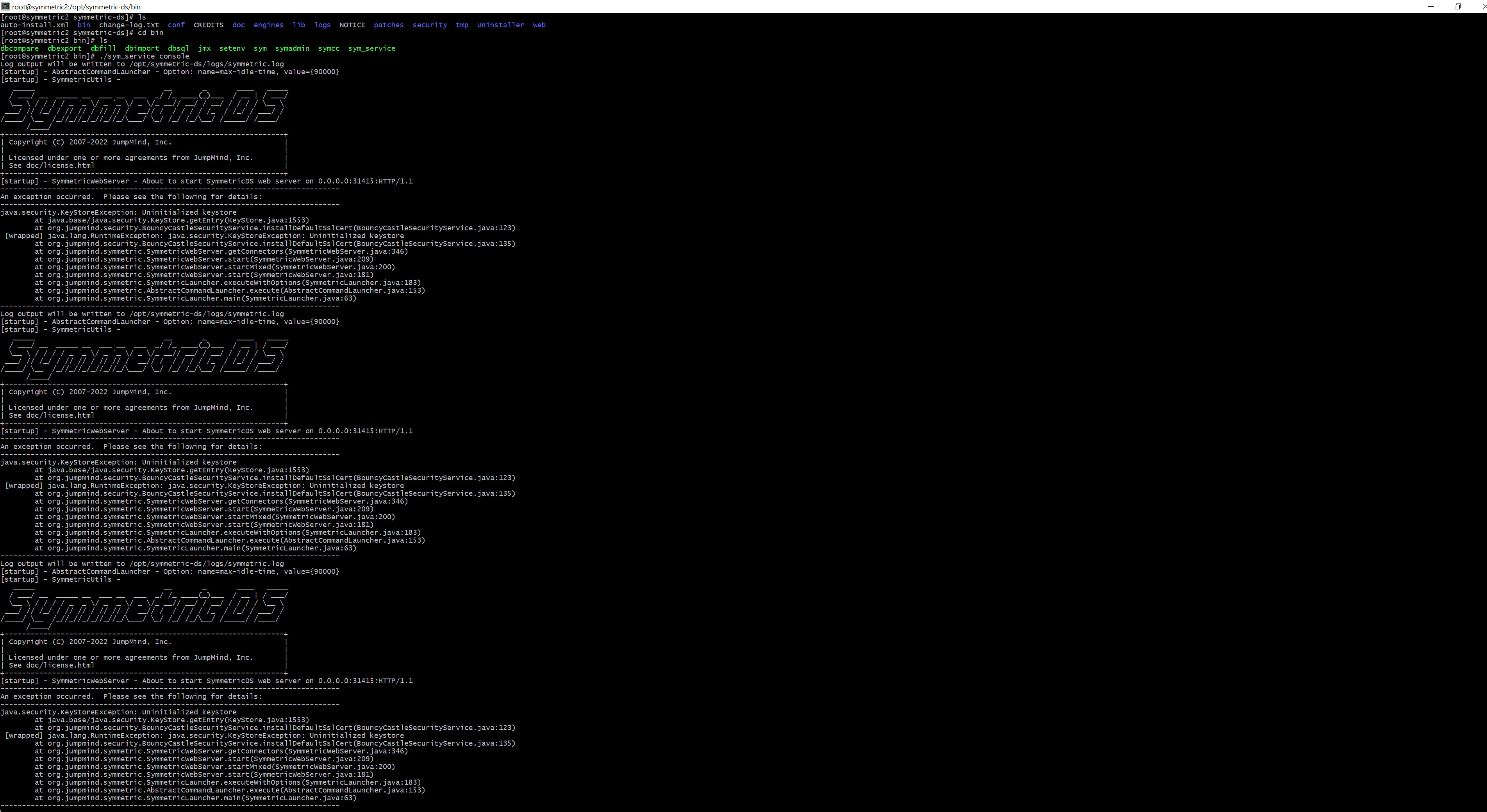 I have commented out the 3 configuration keys in conf/sym_service.conf and deleted security/keystore as advised. The result is however an exception when trying to start sym_service. The exception says uninitialized keystore. It is probably caused by deleting the keystore file. sym_service does not start. It keeps getting restarted in a loop, after this exception. Hence, it never starts listening on its port. ./sym_service console Log output will be written to /opt/symmetric-ds/logs/symmetric.log [startup] - AbstractCommandLauncher - Option: name=max-idle-time, value={90000} [startup] - SymmetricUtils - _____ __ _ ____ _____ / ___/ __ _____ __ ___ __ ___ _/ /_ ____(_)___ / __ | / ___/ \__ \ / / / / _ `_ \/ _ `_ \/ _ \/_ __// __/ / __/ / / / / \__ \ ___/ // /_/ / // // / // // / __// / / / / / /_ / /_/ / ___/ / /____/ \__ /_//_//_/_//_//_/\___/ \_/ /_/ /_/\__/ /_____/ /____/ /____/ +-----------------------------------------------------------------+ | Copyright (C) 2007-2022 JumpMind, Inc. | | | | Licensed under one or more agreements from JumpMind, Inc. | | See doc/license.html | +-----------------------------------------------------------------+ [startup] - SymmetricWebServer - About to start SymmetricDS web server on 0.0.0.0:31415:HTTP/1.1 ------------------------------------------------------------------------------- An exception occurred. Please see the following for details: ------------------------------------------------------------------------------- java.security.KeyStoreException: Uninitialized keystore at java.base/java.security.KeyStore.getEntry(KeyStore.java:1553) at org.jumpmind.security.BouncyCastleSecurityService.installDefaultSslCert(BouncyCastleSecurityService.java:123) [wrapped] java.lang.RuntimeException: java.security.KeyStoreException: Uninitialized keystore at org.jumpmind.security.BouncyCastleSecurityService.installDefaultSslCert(BouncyCastleSecurityService.java:135) at org.jumpmind.symmetric.SymmetricWebServer.getConnectors(SymmetricWebServer.java:346) at org.jumpmind.symmetric.SymmetricWebServer.start(SymmetricWebServer.java:209) at org.jumpmind.symmetric.SymmetricWebServer.startMixed(SymmetricWebServer.java:200) at org.jumpmind.symmetric.SymmetricWebServer.start(SymmetricWebServer.java:181) at org.jumpmind.symmetric.SymmetricLauncher.executeWithOptions(SymmetricLauncher.java:183) at org.jumpmind.symmetric.AbstractCommandLauncher.execute(AbstractCommandLauncher.java:153) at org.jumpmind.symmetric.SymmetricLauncher.main(SymmetricLauncher.java:63) ------------------------------------------------------------------------------- |