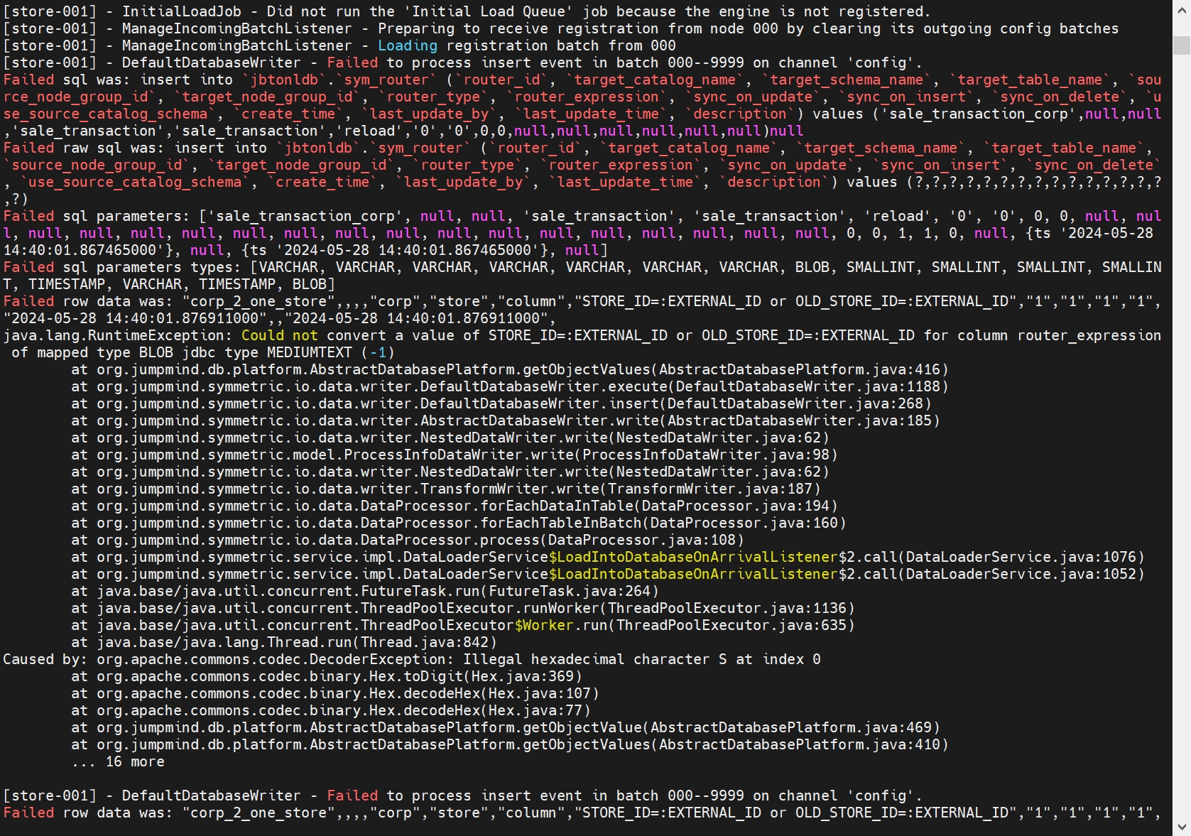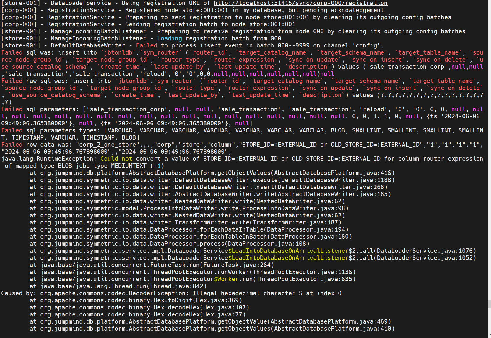 | Steps To Reproduce | run bin/sym,see log display error: [store-001] - DefaultDatabaseWriter - Failed to process insert event in batch 000--9999 on channel 'config'. Failed sql was: insert into `jbtonldb`.`sym_router` (`router_id`, `target_catalog_name`, `target_schema_name`, `target_table_name`, `source_node_group_id`, `target_node_group_id`, `router_type`, `router_expression`, `sync_on_update`, `sync_on_insert`, `sync_on_delete`, `use_source_catalog_schema`, `create_time`, `last_update_by`, `last_update_time`, `description`) values ('sale_transaction_corp',null,null,'sale_transaction','sale_transaction','reload','0','0',0,0,null,null,null,null,null,null)null Failed raw sql was: insert into `jbtonldb`.`sym_router` (`router_id`, `target_catalog_name`, `target_schema_name`, `target_table_name`, `source_node_group_id`, `target_node_group_id`, `router_type`, `router_expression`, `sync_on_update`, `sync_on_insert`, `sync_on_delete`, `use_source_catalog_schema`, `create_time`, `last_update_by`, `last_update_time`, `description`) values (?,?,?,?,?,?,?,?,?,?,?,?,?,?,?,?) Failed sql parameters: ['sale_transaction_corp', null, null, 'sale_transaction', 'sale_transaction', 'reload', '0', '0', 0, 0, null, null, null, null, null, null, null, null, null, null, null, null, null, null, null, null, null, null, 0, 0, 1, 1, 0, null, {ts '2024-05-28 14:40:01.867465000'}, null, {ts '2024-05-28 14:40:01.867465000'}, null] Failed sql parameters types: [VARCHAR, VARCHAR, VARCHAR, VARCHAR, VARCHAR, VARCHAR, VARCHAR, BLOB, SMALLINT, SMALLINT, SMALLINT, SMALLINT, TIMESTAMP, VARCHAR, TIMESTAMP, BLOB] Failed row data was: "corp_2_one_store",,,,"corp","store","column","STORE_ID=:EXTERNAL_ID or OLD_STORE_ID=:EXTERNAL_ID","1","1","1","1","2024-05-28 14:40:01.876911000",,"2024-05-28 14:40:01.876911000", java.lang.RuntimeException: Could not convert a value of STORE_ID=:EXTERNAL_ID or OLD_STORE_ID=:EXTERNAL_ID for column router_expression of mapped type BLOB jdbc type MEDIUMTEXT (-1) at org.jumpmind.db.platform.AbstractDatabasePlatform.getObjectValues(AbstractDatabasePlatform.java:416) at org.jumpmind.symmetric.io.data.writer.DefaultDatabaseWriter.execute(DefaultDatabaseWriter.java:1188) at org.jumpmind.symmetric.io.data.writer.DefaultDatabaseWriter.insert(DefaultDatabaseWriter.java:268) at org.jumpmind.symmetric.io.data.writer.AbstractDatabaseWriter.write(AbstractDatabaseWriter.java:185) at org.jumpmind.symmetric.io.data.writer.NestedDataWriter.write(NestedDataWriter.java:62) at org.jumpmind.symmetric.model.ProcessInfoDataWriter.write(ProcessInfoDataWriter.java:98) at org.jumpmind.symmetric.io.data.writer.NestedDataWriter.write(NestedDataWriter.java:62) at org.jumpmind.symmetric.io.data.writer.TransformWriter.write(TransformWriter.java:187) at org.jumpmind.symmetric.io.data.DataProcessor.forEachDataInTable(DataProcessor.java:194) at org.jumpmind.symmetric.io.data.DataProcessor.forEachTableInBatch(DataProcessor.java:160) at org.jumpmind.symmetric.io.data.DataProcessor.process(DataProcessor.java:108) at org.jumpmind.symmetric.service.impl.DataLoaderService$LoadIntoDatabaseOnArrivalListener$2.call(DataLoaderService.java:1076) at org.jumpmind.symmetric.service.impl.DataLoaderService$LoadIntoDatabaseOnArrivalListener$2.call(DataLoaderService.java:1052) at java.base/java.util.concurrent.FutureTask.run(FutureTask.java:264) at java.base/java.util.concurrent.ThreadPoolExecutor.runWorker(ThreadPoolExecutor.java:1136) at java.base/java.util.concurrent.ThreadPoolExecutor$Worker.run(ThreadPoolExecutor.java:635) at java.base/java.lang.Thread.run(Thread.java:842) Caused by: org.apache.commons.codec.DecoderException: Illegal hexadecimal character S at index 0 at org.apache.commons.codec.binary.Hex.toDigit(Hex.java:369) at org.apache.commons.codec.binary.Hex.decodeHex(Hex.java:107) at org.apache.commons.codec.binary.Hex.decodeHex(Hex.java:77) at org.jumpmind.db.platform.AbstractDatabasePlatform.getObjectValue(AbstractDatabasePlatform.java:469) at org.jumpmind.db.platform.AbstractDatabasePlatform.getObjectValues(AbstractDatabasePlatform.java:410) ... 16 more  | ||||