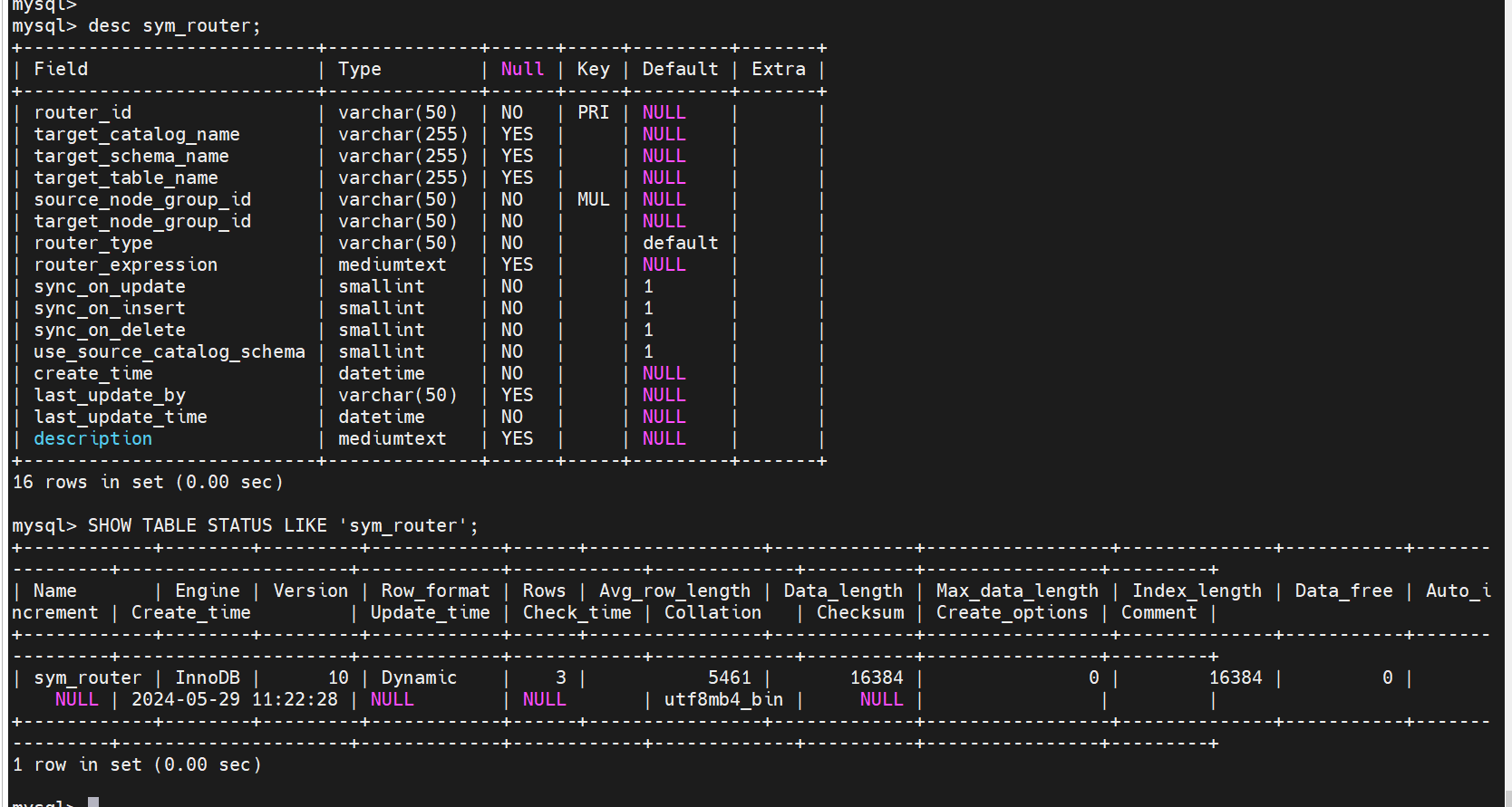mysql> desc sym_router; +---------------------------+--------------+------+-----+---------+-------+ | Field | Type | Null | Key | Default | Extra | +---------------------------+--------------+------+-----+---------+-------+ | router_id | varchar(50) | NO | PRI | NULL | | | target_catalog_name | varchar(255) | YES | | NULL | | | target_schema_name | varchar(255) | YES | | NULL | | | target_table_name | varchar(255) | YES | | NULL | | | source_node_group_id | varchar(50) | NO | MUL | NULL | | | target_node_group_id | varchar(50) | NO | | NULL | | | router_type | varchar(50) | NO | | default | | | router_expression | mediumtext | YES | | NULL | | | sync_on_update | smallint | NO | | 1 | | | sync_on_insert | smallint | NO | | 1 | | | sync_on_delete | smallint | NO | | 1 | | | use_source_catalog_schema | smallint | NO | | 1 | | | create_time | datetime | NO | | NULL | | | last_update_by | varchar(50) | YES | | NULL | | | last_update_time | datetime | NO | | NULL | | | description | mediumtext | YES | | NULL | | +---------------------------+--------------+------+-----+---------+-------+ 16 rows in set (0.00 sec) mysql> SHOW TABLE STATUS LIKE 'sym_router'; +------------+--------+---------+------------+------+----------------+-------------+-----------------+--------------+-----------+----------------+---------------------+-------------+------------+-------------+----------+----------------+---------+ | Name | Engine | Version | Row_format | Rows | Avg_row_length | Data_length | Max_data_length | Index_length | Data_free | Auto_increment | Create_time | Update_time | Check_time | Collation | Checksum | Create_options | Comment | +------------+--------+---------+------------+------+----------------+-------------+-----------------+--------------+-----------+----------------+---------------------+-------------+------------+-------------+----------+----------------+---------+ | sym_router | InnoDB | 10 | Dynamic | 3 | 5461 | 16384 | 0 | 16384 | 0 | NULL | 2024-05-29 11:22:28 | NULL | NULL | utf8mb4_bin | NULL | | | +------------+--------+---------+------------+------+----------------+-------------+-----------------+--------------+-----------+----------------+---------------------+-------------+------------+-------------+----------+----------------+---------+ 1 row in set (0.00 sec)  |